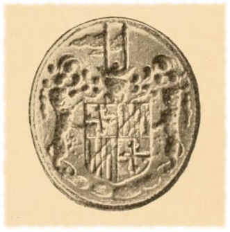 George Calvert’s arms appearing on a letter of his dated March 9, 1623. George Calvert died in 1632. Initially George was intended to be granted the Charter of Maryland, but due to his death, it was granted to his first son Cecil Calvert instead. See: Coakley (1984) Maryland Historical Magazine, p 259 and Wikipedia: George Calvert, 1st Baron Baltimore. |
