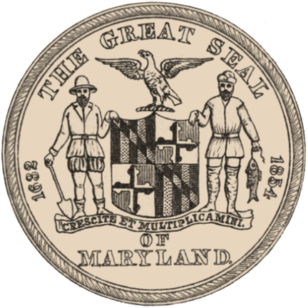Great Seal of Maryland, 1794 With the Great Seal of 1794, Maryland symbolically parted ways with her colonial past by removing any reference thereto. A new Seal for a new (18 year old) State and member of the United States of America. See: Hall, C (1885), The Great Seal of Maryland, page 36. |