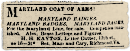 Appearing in the Richmond Dispatch, Sept 17, 1862, this ad suggests that the Maryland Line acquired their badges from H. H. Kayton, Letter Cutter, possibly including their Maryland Cross badges. |
