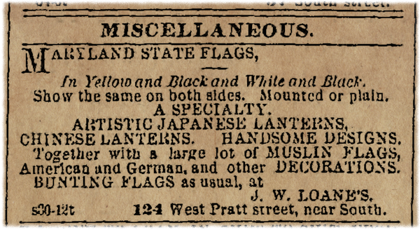 1880 - Advertisment in The Baltimore Sun, October 4th, reads: “Maryland State Flags, In Yellow and Black and White and Black.